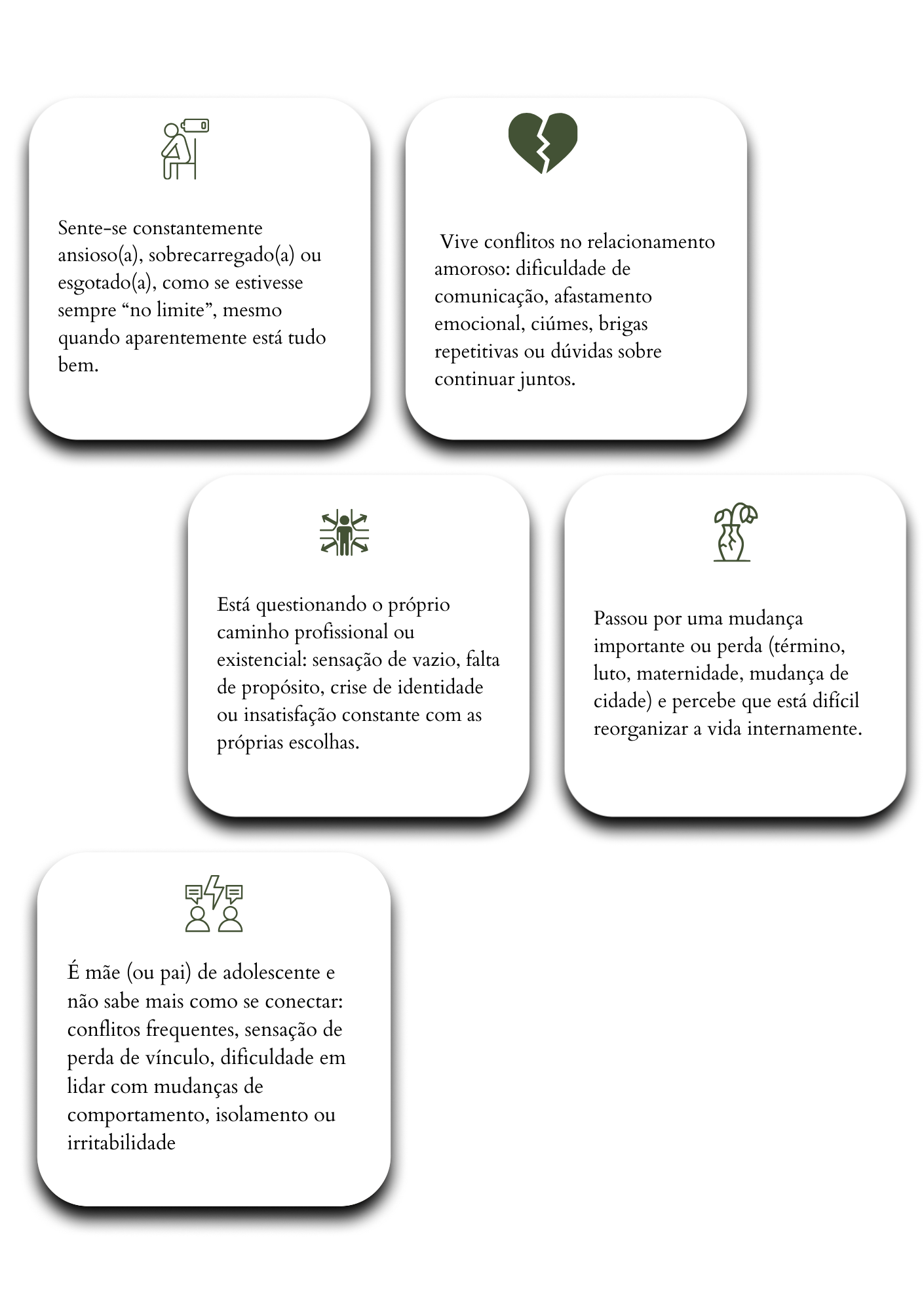 Há fases em que o que sentimos e pensamos parece tomar conta de tudo, indo além do que conseguimos administrar sozinhos. Abaixo, você encontra situações recorrentes que muitas vezes levam alguém a considerar o início de um acompanhamento psicológico
